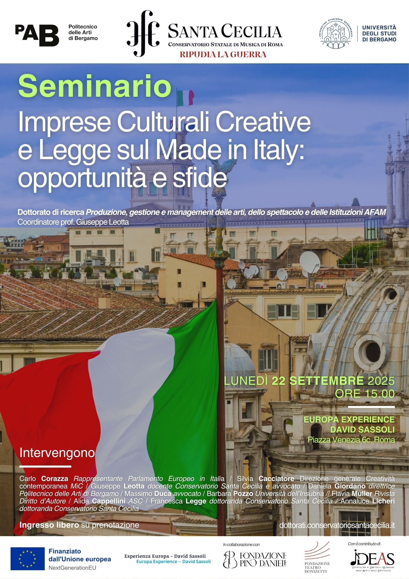 Terminata la pausa estiva, il Corso di Dottorato in Produzione, Gestione e Management delle Arti, dello Spettacolo e delle Istituzioni AFAM del Conservatorio di Musica “Santa Cecilia” organizza un nuovo appuntamento di approfondimento dedicato al rapporto tra Made in Italy e imprese culturali e creative.